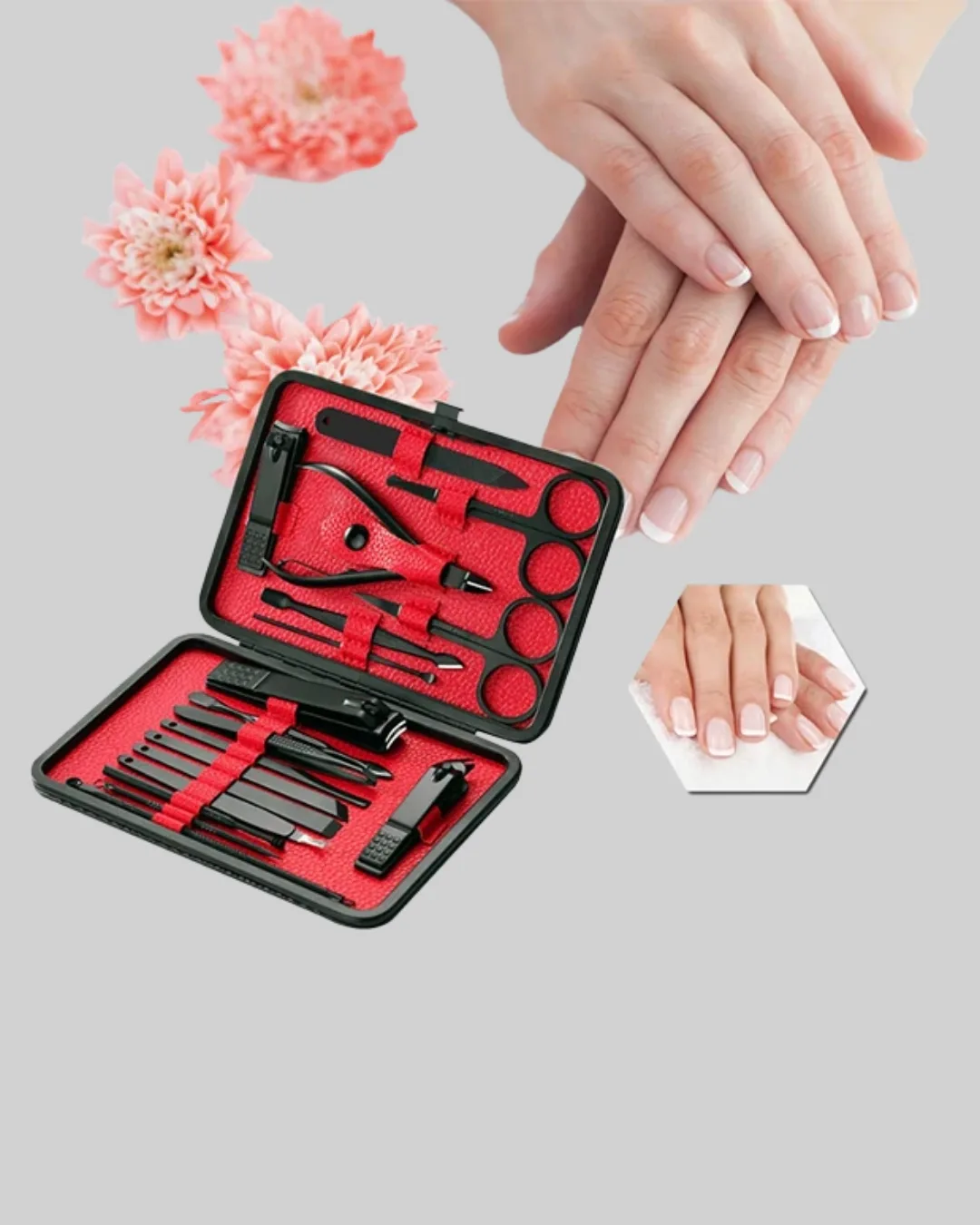 Profesyonel bakım deneyimini evinize taşıyan bu 17 parçalık manikür seti, el ve ayak bakımınızı eksiksiz yapmanız için tasarlanmıştır. Paslanmaz çelikten üretilmiş tüm parçaları, uzun ömürlü kullanım ve hijyenik temizlik imkanı sunar. Korozyona dayanıklı yapısı sayesinde zamanla bozulmaz, keskinliğini korur. Set içerisinde büyük, küçük ve sivri uçlu tırnak makasları, törpü, cımbız, pedikür bıçakları, tırnak kaldırma aparatı ve kulak temizleme aparatı gibi birçok farklı alet bulunur. Yeni nesil siyah kaymaz parlatma teknolojisi sayesinde aletler hem şık bir görünüme sahiptir hem de kolay kavrama sağlar. Şık deri kaplama kutusu, tüm parçaları düzenli şekilde saklamanıza yardımcı olur. Tek tuşla açılabilen bu kutu, hafif ve taşınabilir yapısıyla seyahatlerde de yanınızda taşınabilir. Günlük kullanım için pratik, hediye seçeneği olarak da şık bir alternatiftir.