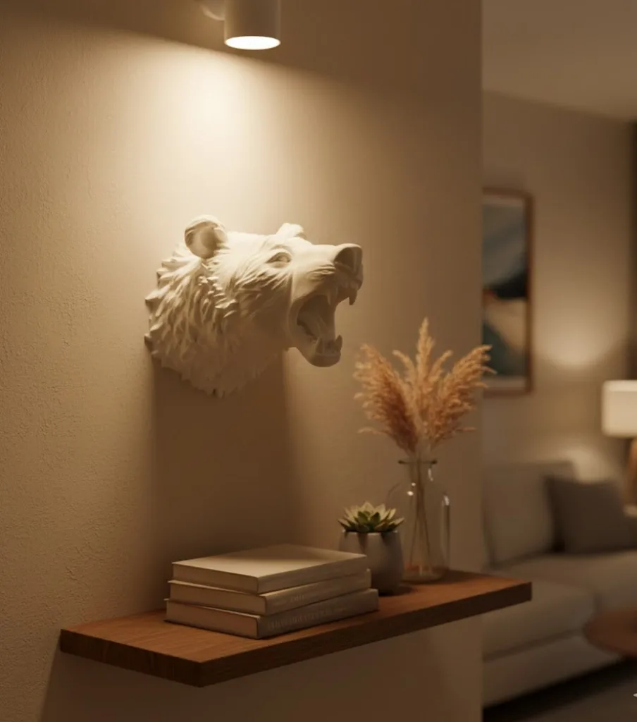 Beyaz 3D ayı başı duvar heykeli, dekorasyonuna modern, etkileyici ve güçlü bir dokunuş eklemek isteyenler için özel olarak tasarlanmış bir üründür. 25x19 cm ölçülerindeki bu dekoratif figür, beyaz renginin sadeliği ve şıklığı ile hem modern hem de minimal dekorasyon tarzlarına mükemmel uyum sağlar. Ürünün detaylı yüz hatları dikkat çekici bir gerçekçilik sunarken, 3 boyutlu kabartı yapısı duvarda güçlü bir gölge etkisi oluşturur. Hafif ve sağlam yapısı sayesinde kolayca duvara monte edilebilir. Odanın odak noktası olması için tek başına kullanılabileceği gibi, galeriler, çalışma odaları, genç odaları, ofisler veya tasarım ağırlıklı ortamlar için de harika bir tamamlayıcıdır. Ayı figürü; güç, cesaret ve koruyucu enerji ile ilişkilendirildiği için manevi anlamda bir sembol arayan kullanıcıların da ilk tercihleri arasında yer alır. Estetik tasarımı sayesinde fotoğraf çekimleri, video çekim alanları, stüdyo dekorasyonları veya mağaza vitrinlerinde de çok şık bir görünüm sağlar. Beyaz rengi, her renkteki duvar ile uyumlu olduğu için dekorasyon seçeneklerini genişletir. Ayrıca özel günler için benzersiz bir hediye seçeneğidir. Şık, farklı ve anlamı olan dekoratif objeler sevenler için ideal bir alternatiftir.