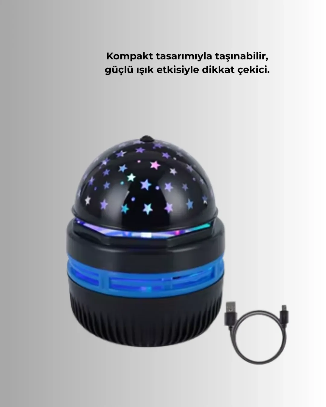 Galaxy Projektörlü Gece Lambası, bulunduğunuz her ortamı yıldızlarla süsleyen romantik bir dekorasyon ürünüdür. Renkli ışıkları döner mekanizma sayesinde tavana yansır ve gökyüzü hissi yaratır. Göz yormayan yumuşak ışığı sayesinde gece lambası olarak kullanılabilir. Romantik akşam yemeklerinde, yıl dönümlerinde veya rahatlama anlarında harika bir atmosfer oluşturur. USB ile çalıştığı için priz, bilgisayar veya powerbank üzerinden kolayca enerji alır. Sessiz motoru sayesinde çalışırken rahatsız edici bir ses çıkarmaz. Şeffaf üst kapakla ışığı doğrudan veya yansıtmalı olarak kullanabilirsiniz. 360° dönüş özelliği, ışığın odanın her noktasına eşit dağılmasını sağlar. Kaliteli plastik malzemesi dayanıklıdır ve uzun süre kullanım sağlar. Kompakt boyutu taşımayı kolaylaştırır. Romantik, huzurlu ve büyüleyici bir atmosfer istiyorsanız bu gece lambası tam size göre.