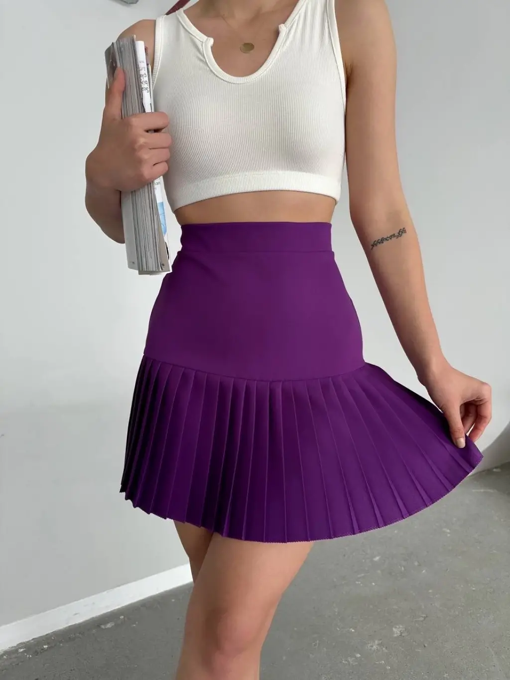 Altı pliseli mini etek, farklı renk seçenekleri ile stilinizi tamamlayacak bir parçadır. Ürün, yüksek bel kesimi ve kısa boyuyla şık bir görünüm sunar.