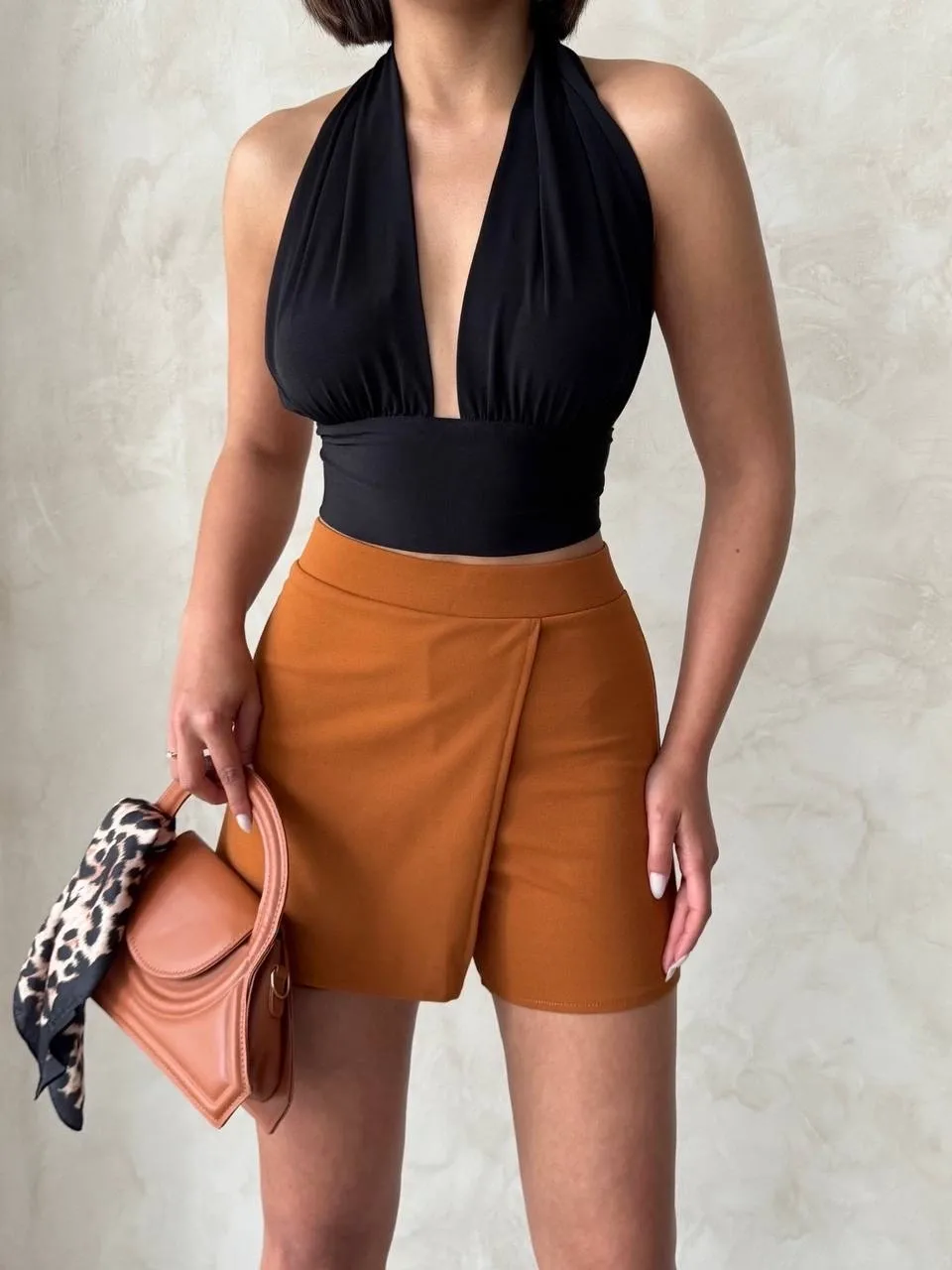 Kombinlerinize kolayca uyum sağlayacak olan Kapaklı Şort Etek Camel S208, gardırobunuzun vazgeçilmezi olmaya aday.