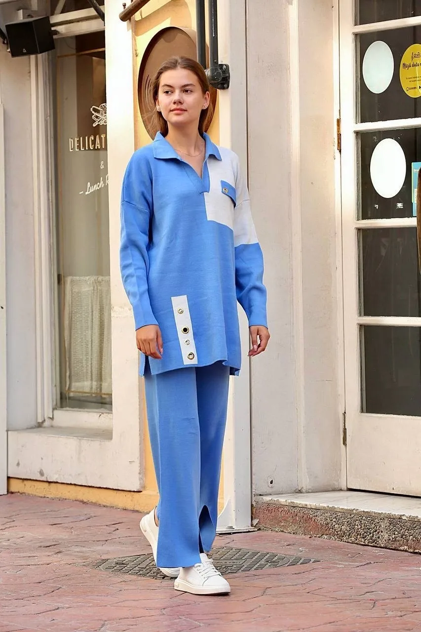 Düz kesim pantolon ve uzun kollu bluzdan oluşan takım seti.