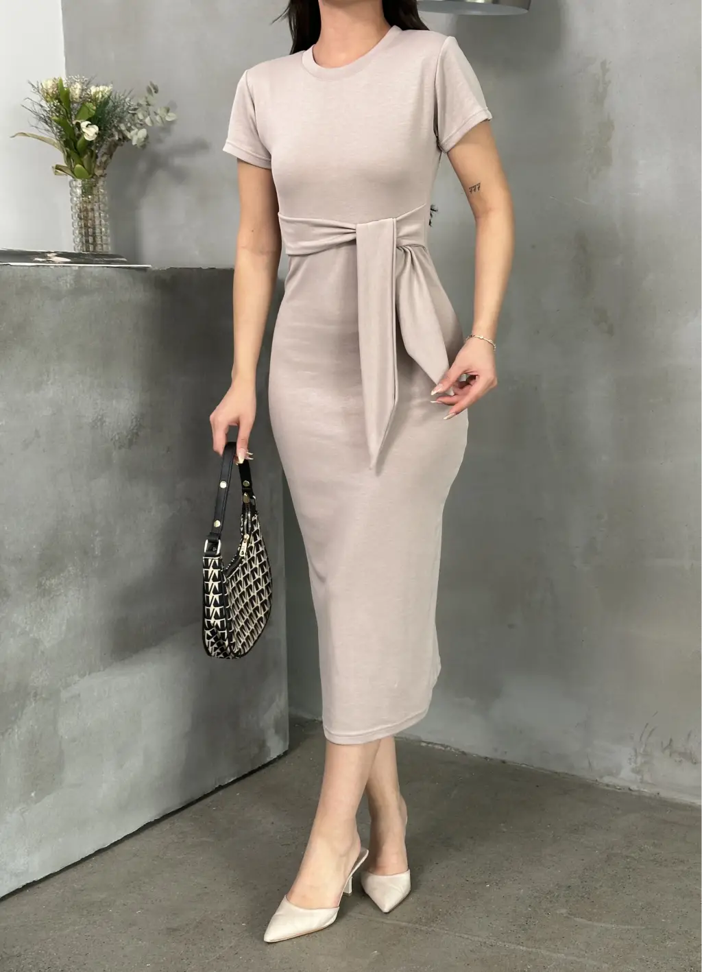 Bu bej renkli Kuşaklı Model Esnek Kumaşlı Elbise, şıklığı ve rahatlığı bir arada sunuyor.