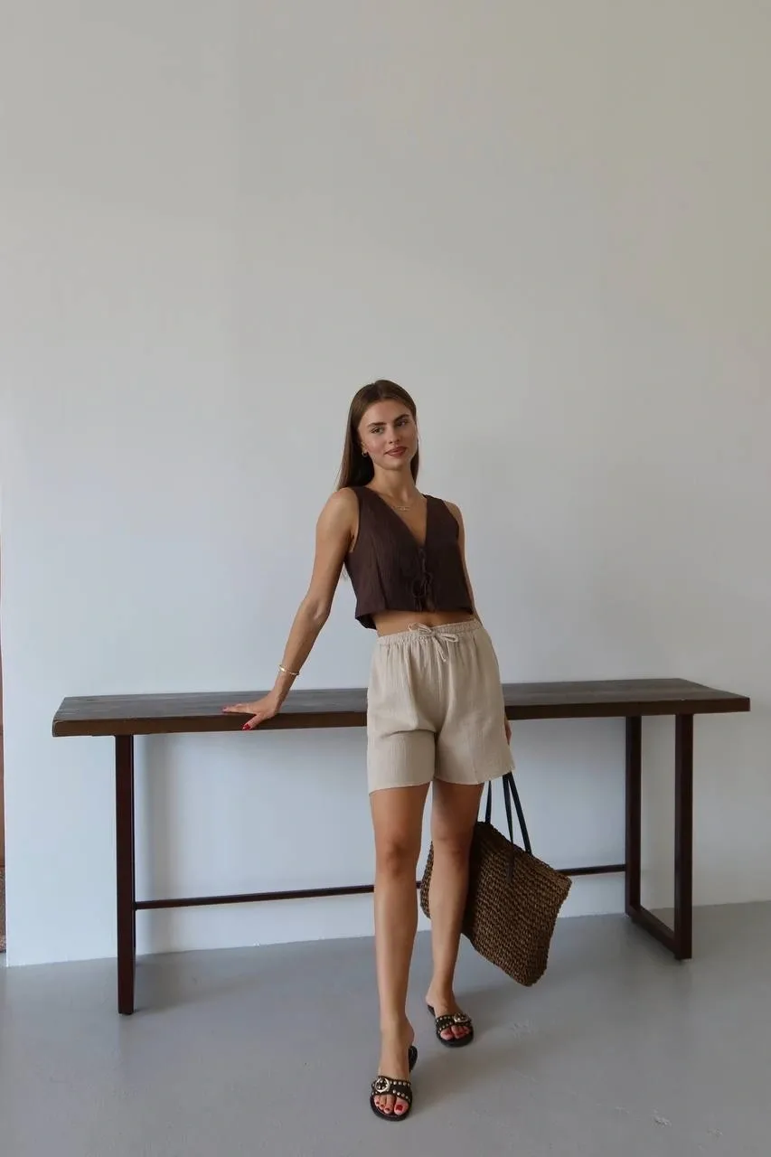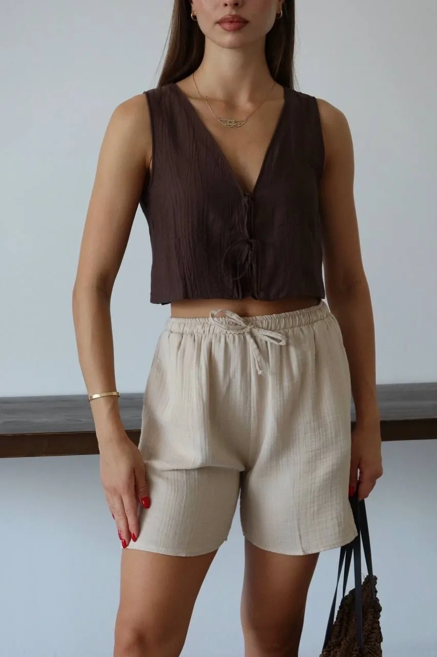 Bu bağcıklı bej şort, hem şık hem de rahat bir seçenektir. Müslin kumaştan üretilmiş olan bu şort, yaz aylarında vazgeçilmeziniz olmaya aday. İster günlük kombinlerinizde ister plajda şık bir alternatif arıyorsanız, bu şort tam size göre!