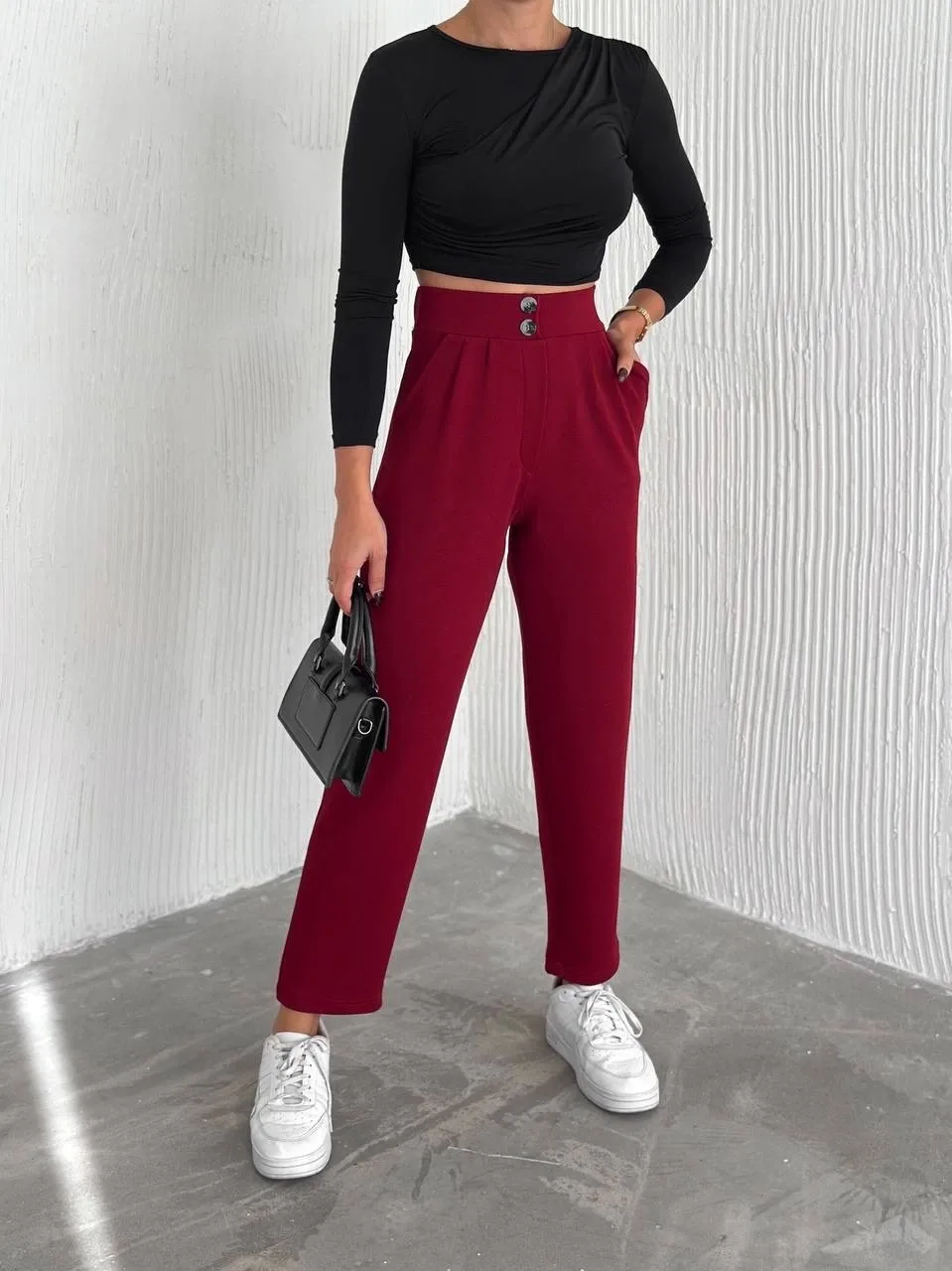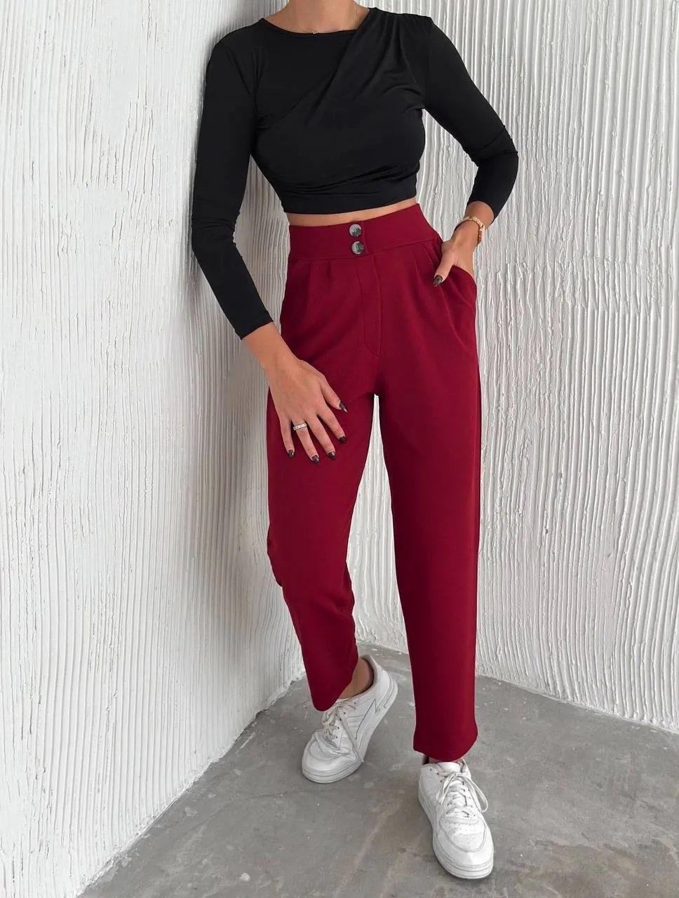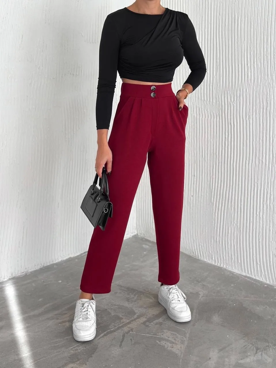 örme krep pantolon çift düğmeli modeli, şıklığı ve konforu bir arada sunar.
