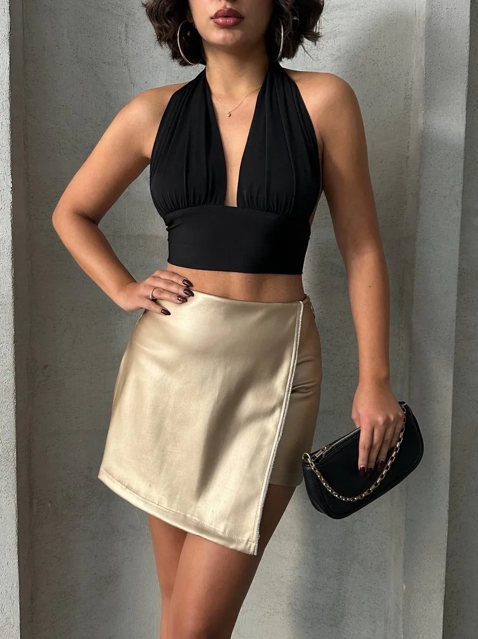 Şıklık ve rahatlığı bir arada sunan Taşlı Şort Etek Deri Gold H240018 ile tarzınızı konuşturun.