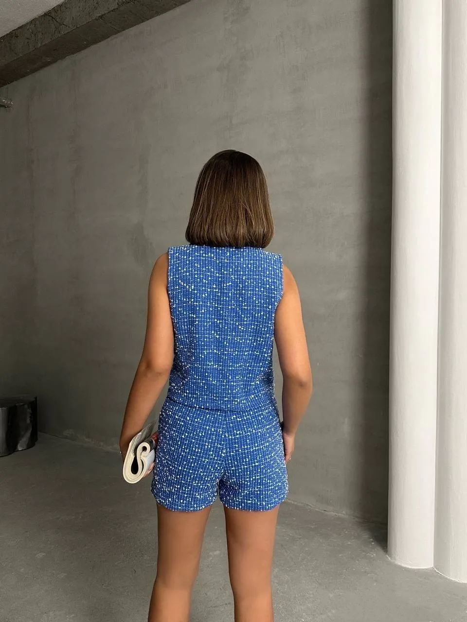 Yelekli Şort Takım Saks ile şıklığı ve rahatlığı bir arada yaşayın. Bu takım, kadın giyim kategorisinde yer almaktadır ve modern tasarımıyla dikkat çekmektedir.