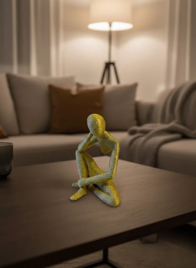Sarı insan figürü biblo, düşünceli duruşu ve yalın tasarımıyla dekorasyona karakter katar. Küçük boyutları sayesinde dar alanlarda bile estetik bir tamamlayıcı olarak tercih edilebilir. Evde, ofiste veya çalışma alanlarında masa üstü ya da raf dekoru olarak kullanılabilir. Loş ya da aydınlık ortamlarda şık bir duruş sergileyerek mekâna modern bir hava kazandırır.