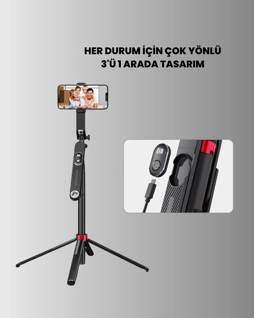 Tripodlu selfie çubuğu, fotoğraf ve video çekimlerinde stabilite ve kullanım kolaylığı sunmak için tasarlanmıştır. Uzatılabilir gövdesi sayesinde geniş açılı çekimler yapılabilir. Tripod ayakları sayesinde sabit ve titreşimsiz çekimler mümkün hale gelir. Telefon tutucu kısmı ayarlanabilir yapıya sahiptir ve dikey–yatay çekim desteği sunar. Uzaktan kumanda ile çekim yapılabilmesi, kullanıcıya büyük bir rahatlık sağlar. Canlı yayınlar, vlog çekimleri ve görüntülü görüşmeler için ideal bir çözümdür. Katlanabilir ve hafif tasarımı ile taşınması kolaydır. Günlük kullanımda ve seyahatlerde rahatlıkla tercih edilebilir. Dayanıklı yapısı uzun ömürlü kullanım sunar. Tripodlu selfie stick, sosyal medya içerikleri üretmek, canlı yayın yapmak ve fotoğraf çekimlerini daha profesyonel hale getirmek isteyenler için fonksiyonel bir yardımcıdır.