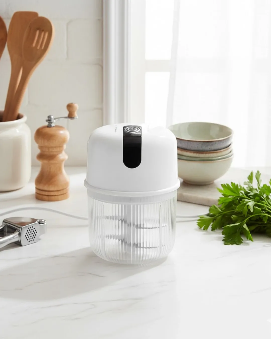 Elektrikli sarımsak ezici, modern mutfakların ihtiyaçlarına cevap verecek şekilde tasarlanmıştır. Hafif ve taşınabilir yapısı ile her mutfakta rahatlıkla kullanılabilir. USB şarjlı 1300 mAh bataryası uzun ömürlü kullanım sunar. Tek tuşla çalışma sistemi sayesinde zahmetsiz kullanım sağlar. Paslanmaz çelik bıçak ile hızlı ve etkili doğrama yapılır. 250 ml haznesi ile günlük yemek hazırlıkları için idealdir. Güvenlik kapağı, motorun zarar görmesini önler. Temizliği kolaydır ve hijyenik kullanım sağlar. Pratik, güvenli ve fonksiyonel bir mutfak yardımcısıdır.