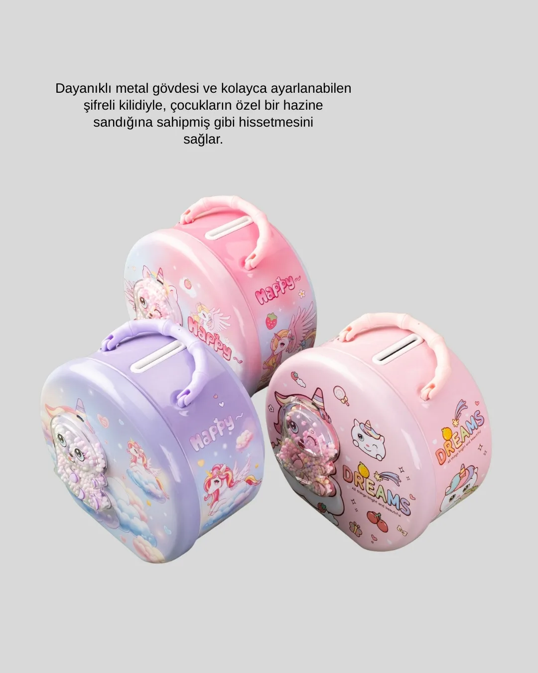 Bu şifreli metal çocuk kasası, çocukların hem güvenli saklama hem de bireysellik duygusu kazanmasına yardımcı olur. Sağlam metal gövdesi sayesinde darbelere karşı dayanıklıdır. Ayarlanabilir şifre sistemi, çocukların kasayı kendi başına kullanmasına imkân tanır. Böylece çocuklar gizlilik, sorumluluk ve özgüven geliştirir. Çocuk odasında dekoratif bir obje olarak kullanılabilirken aynı zamanda para biriktirme alışkanlığı kazandıran eğitici bir üründür. Özel günler için şık ve kullanışlı bir hediyedir.