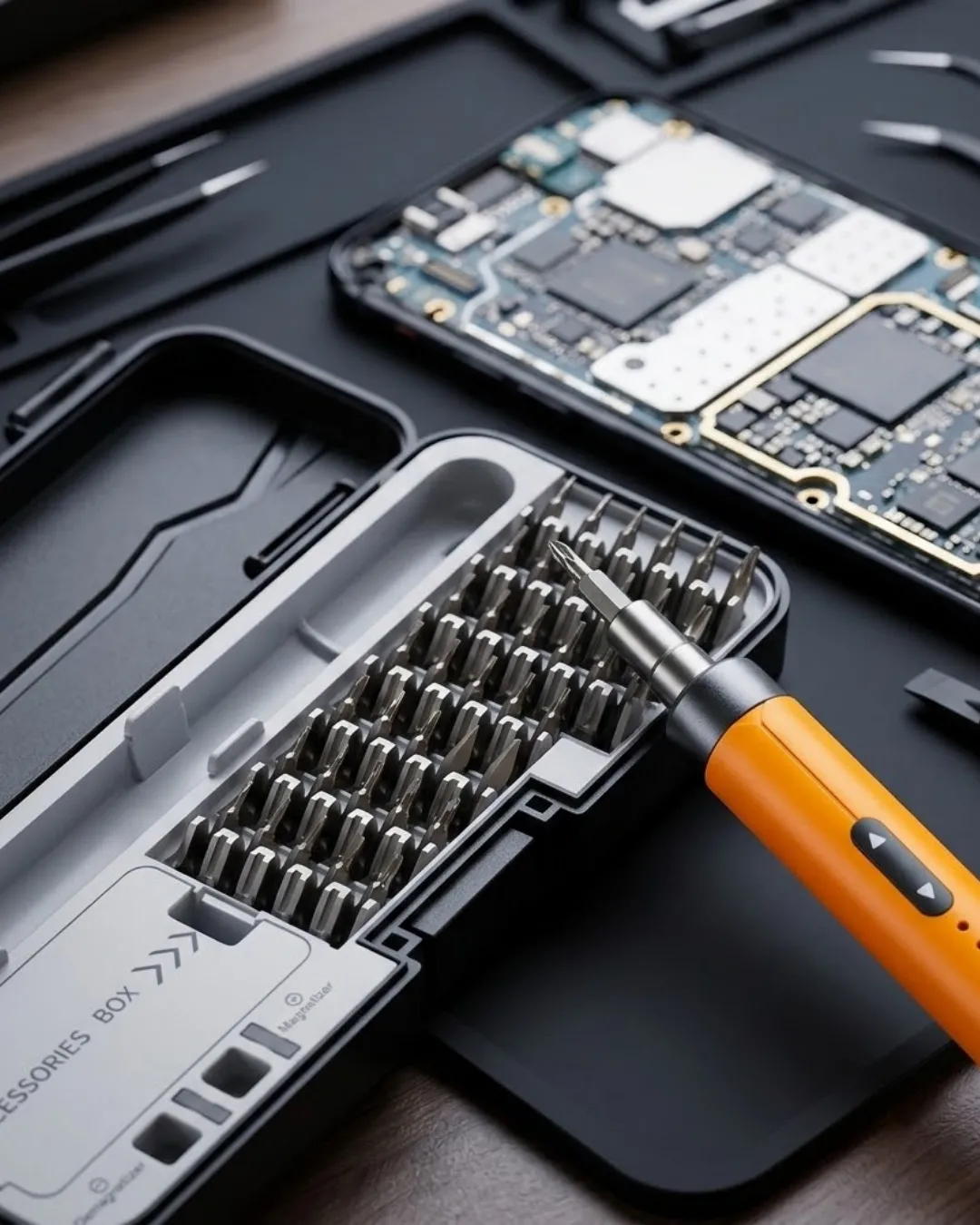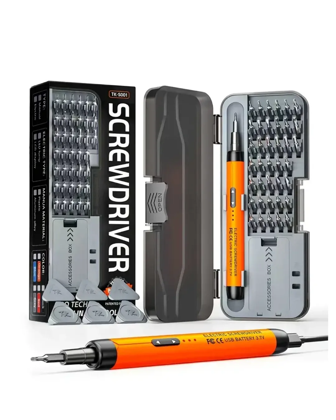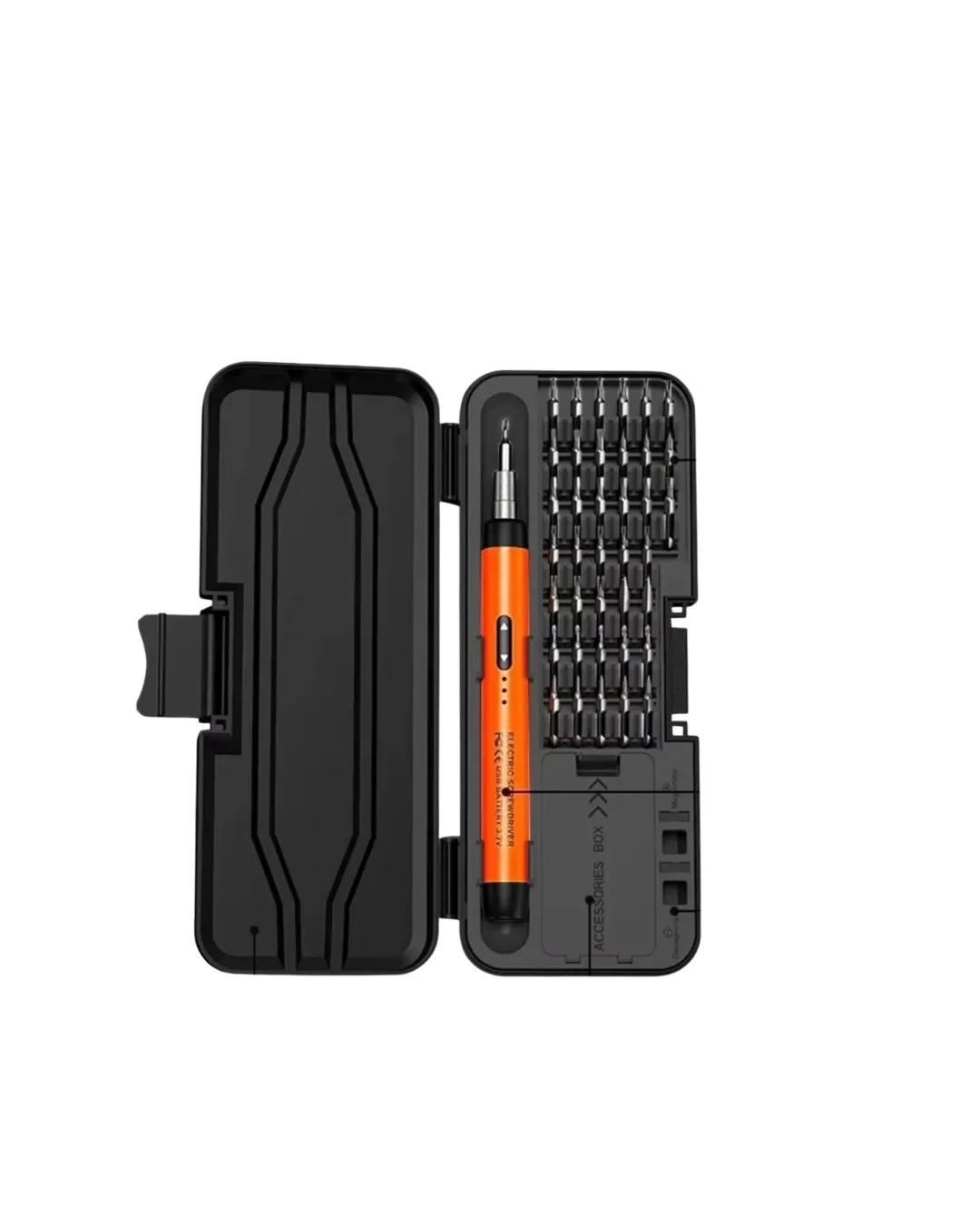 Profesyonel düzeyde tasarlanmış bu kablosuz elektrikli tornavida seti, elektronik onarım işlemlerini kolaylaştıran kapsamlı bir tamir kitidir. 600mAh kapasiteli Li pil sistemi, güçlü ve dengeli performans sunar. Type-C şarj girişi sayesinde hızlı ve güvenli şarj edilebilir. 3.7V DC gerilim ile çalışan sistem, hassas cihazlar için ideal güç seviyesindedir. 1100 devir/dak serbest hız değeri, mikro vidalarda yüksek hassasiyet sağlar. 3.0–3.5 kgf.cm tork gücü sayesinde cihazlara zarar vermeden kontrollü çalışma yapılabilir. İleri ve geri dönüş fonksiyonu, vidalama sürecini hızlandırır. Alüminyum alaşımlı gövdesi hem şık hem dayanıklıdır. Ergonomik yapısı sayesinde tek elle rahat kullanım sunar. 38 adet CRV tornavida ucu ile geniş uyumluluk sağlar. Set içerisinde 1 adet şarj kablosu ve 6 adet sökme penası yer alır. Manyetik aparat ve mıknatıslanma giderici parçalar sayesinde vida kontrolü üst seviyeye çıkar. Cep telefonları, dizüstü bilgisayarlar, kameralar, saatler, PS5, Xbox, Switch ve diğer hassas elektronik ürünlerin tamiri için güvenle kullanılabilir. Bu set, teknik servis çalışanları, elektronik meraklıları ve ev kullanıcıları için kapsamlı, güçlü ve profesyonel bir çözümdür.