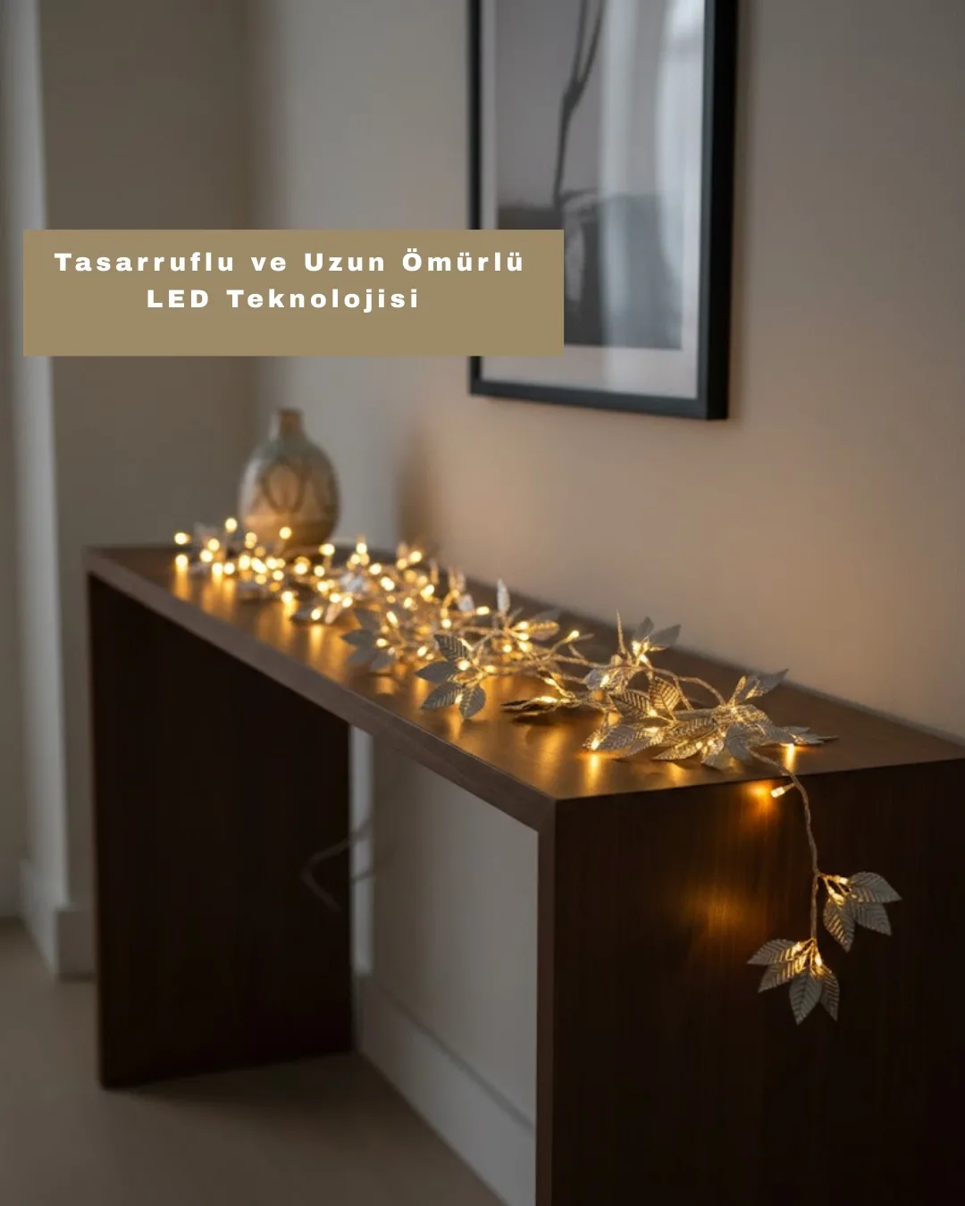 Gümüş yaldızlı yaprak LED ışık, dekoratif aydınlatmada sade ama etkili bir görünüm sunar. Yaprak formundaki detaylar, ürüne doğal bir estetik kazandırırken gümüş rengi ile modern bir duruş sergiler. Pilli yapısı sayesinde priz bağımlılığı olmadan kullanılabilir. Bu özellik, ürünü evin her alanında özgürce konumlandırmaya olanak tanır. Raf, vitrin, masa üstü ve duvar dekorasyonlarında rahatlıkla tercih edilebilir. Sıcak ışık tonu, bulunduğu ortamda huzurlu ve sıcak bir atmosfer yaratır. Kalabalık süslemeler yerine sade ama şık bir dekorasyon isteyenler için idealdir. Yılbaşı süslemeleri ve özel gün dekorları için de uygun bir seçenektir. Yaprak detaylarının metalik yüzeyi, ışık açıkken zarif yansımalar oluşturur. Işık kapalıyken de dekoratif bir aksesuar olarak kullanılabilir. Ev, ofis ve vitrin dekorasyonunda estetik, pratik ve kullanışlı bir LED aydınlatma ürünü arayanlar için ideal bir tercihtir.