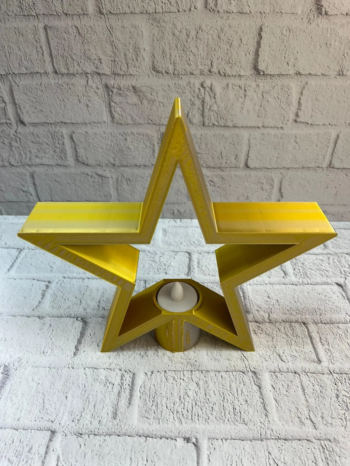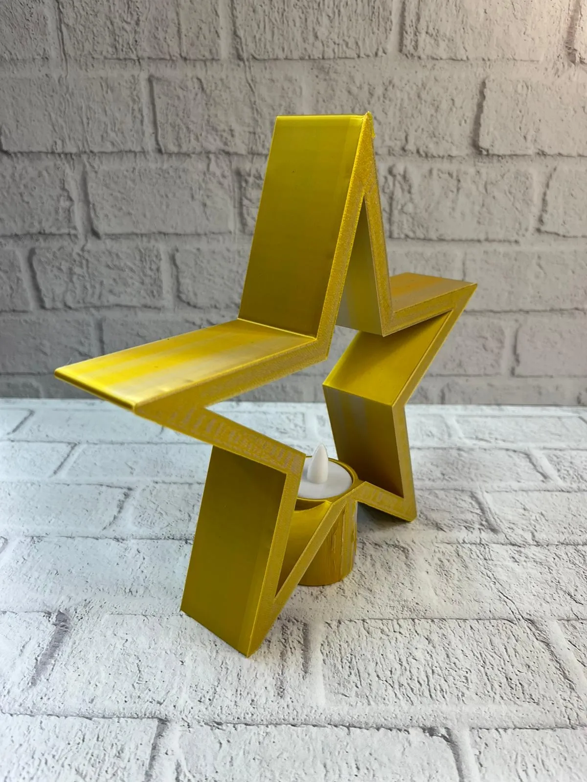 Dekoratif sarı yıldız mumluk, sıcak tonuyla yaşam alanlarına canlılık kazandırır. Raf üstü veya masa üzerinde kullanıldığında mekâna derinlik ve şıklık katar. Mum ışığıyla birlikte loş bir aydınlatma sağlayarak rahatlatıcı bir salon atmosferi oluşturur. Estetik ve işlevsel tasarımıyla ev ve ofis dekorasyonu için şık bir tamamlayıcıdır.