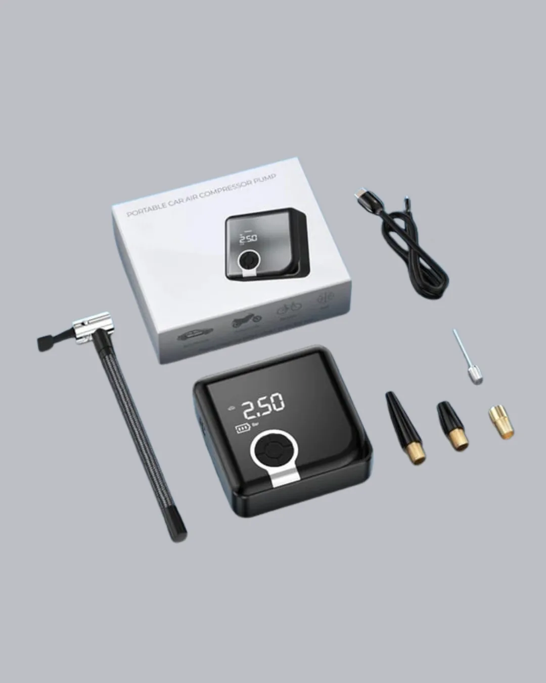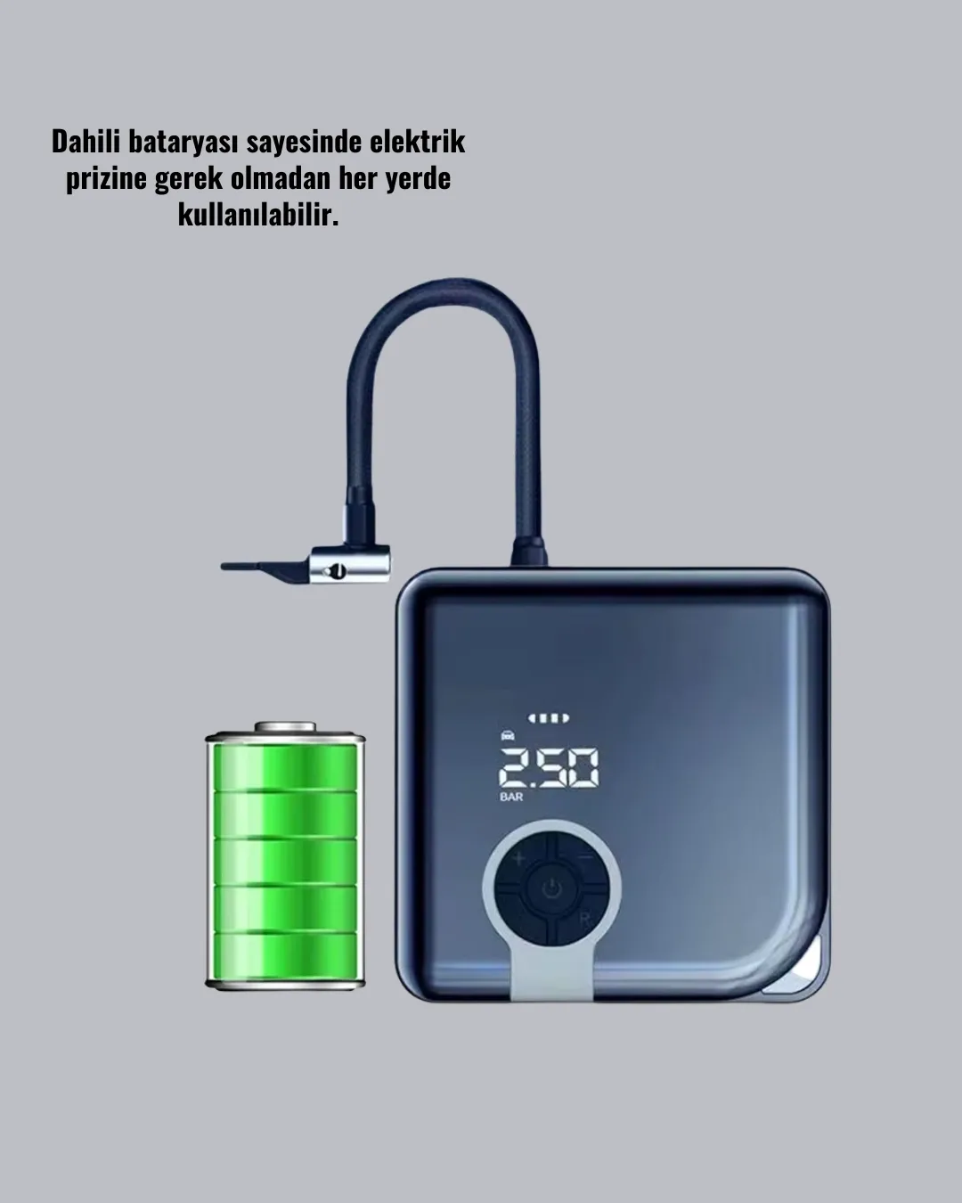 Taşınabilir kablosuz hava kompresörü, modern yaşamın ihtiyaçlarına uygun olarak tasarlanmıştır. Kompakt boyutu ve güçlü motoruyla lastiklerinizi hızlıca şişirir. 150 PSI kapasitesi ile otomobil, motosiklet, bisiklet ve şişme ürünler için güvenilir bir çözümdür. Dijital ekranı sayesinde basıncı hassas bir şekilde ölçebilir ve önceden ayarlayabilirsiniz. Cihaz ayarladığınız değere ulaştığında otomatik kapanarak güvenli bir kullanım sunar. 6000 mAh bataryası güçlü ve uzun süreli kullanım sağlar. Tek şarjla dört lastiği şişirme kapasitesine sahiptir. Type-C girişli şarj özelliği sayesinde hızlı ve güvenli şarj imkanı sunar. SOS ışıkları ve LED aydınlatmaları sayesinde gece veya acil durumlarda ekstra güvenlik sağlar. Dayanıklı gövdesi uzun ömürlü kullanım için tasarlanmış olup, hafif yapısı sayesinde kolay taşınabilir. Şişme yataklar, kamp ürünleri ve spor topları için de kullanılabilmesi, bu ürünü çok yönlü hale getirir. Her araçta mutlaka bulunması gereken akıllı bir yardımcıdır.
